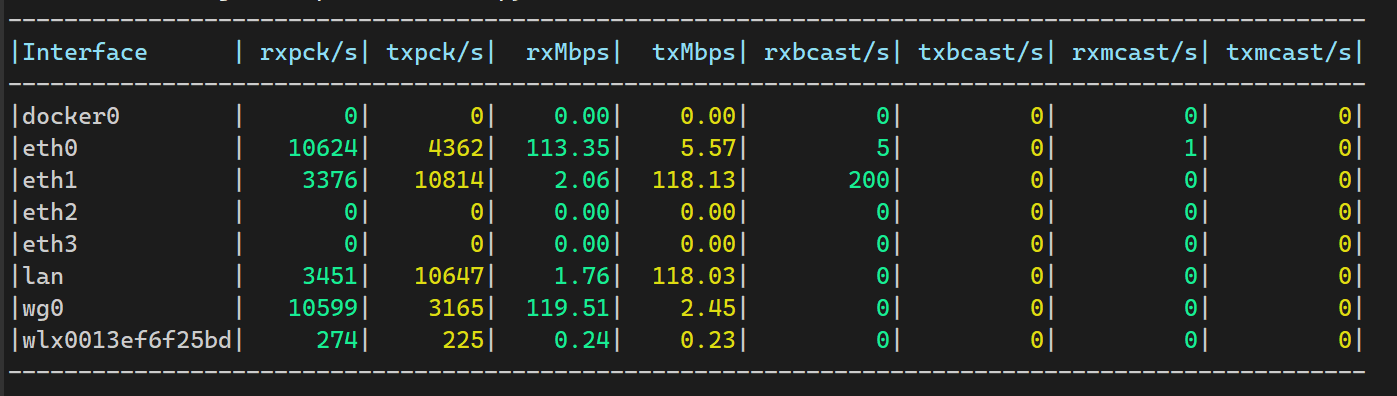 |Interface | rxpck/s| txpck/s| rxMbps| txMbps| rxbcast/s| txbcast/s| rxmcast/s| txmcast/s|